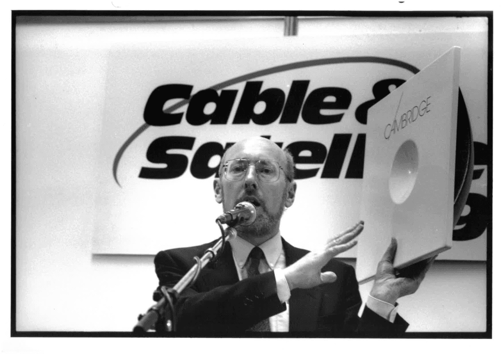 Clive Sinclair at the Cable & Satellite conference, Olympia, with a Cambridge Satellite Dish, 1989. Photograph: The Daily Telegraph, 16 March 1989.