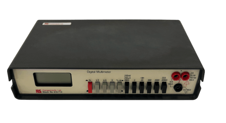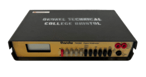 This digital multimeter was used to test electronic components by measuring voltage, current, and resistance. It replaced the earlier TM353 model and offered 26 selectable ranges—suitable for detecting both very weak signals and higher-powered circuits. Like others in the Thandar range, it combined portability with bench-top use. This example is marked with the name of “Brunel Technical College”, most likely linking it to an educational setting in the UK. Instruments like this helped train future engineers as well as support routine electronic servicing.