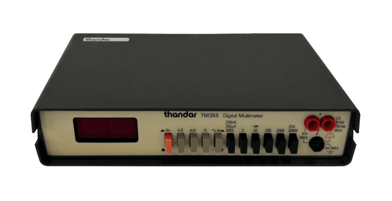 The TM355 used a bright LED display, making it ideal for dimly lit workspaces—though it required more power than the LCD-based models in the same range. It offered 29 test ranges and could detect very small currents, as well as high voltages up to 1000 V—from everyday electronic components and circuits to industrial systems. Like other Thandar multimeters, it could measure resistance and check diodes—components that allow electrical current to flow in only one direction. Usable with batteries or a mains adapter, it was suited to both portable and fixed setups.