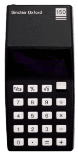 This black calculator added percentage and square root functions to the original Oxford 100 design, marking a small but useful upgrade for everyday calculations. It featured an eight-digit red LED display and algebraic input, and was powered by a standard 9-volt battery. Housed in a rounded case typical of later Oxford models, the 150 represents the incremental expansion of Sinclair’s calculator range as it sought to balance low-cost design with added functionality for home and office users.