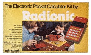 This build-it-yourself calculator kit invited young users to explore how everyday electronics worked—an early precursor to today’s STEM kits. Sold by Radionic Products Ltd., its design closely matches the Sinclair Oxford 150 and references Sinclair on the calculator’s packaging, suggesting shared components or manufacturing links. The finished calculator offered functions like percentages and square roots, all assembled without soldering—making technology hands-on and approachable for learners as young as eleven.