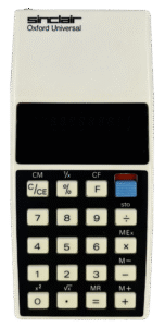 An evolution of the Oxford 100, this white model included additional functions such as memory, percentage, square root, and reciprocal. Its green vacuum fluorescent display (VFD) offered better battery efficiency than earlier LED versions, reflecting a brief move toward lower-power alternatives before LCDs took over the market. The Universal was among the most advanced models in the Oxford range and represents Sinclair’s attempt to stay competitive as cheaper, more efficient Japanese calculators began to dominate.
