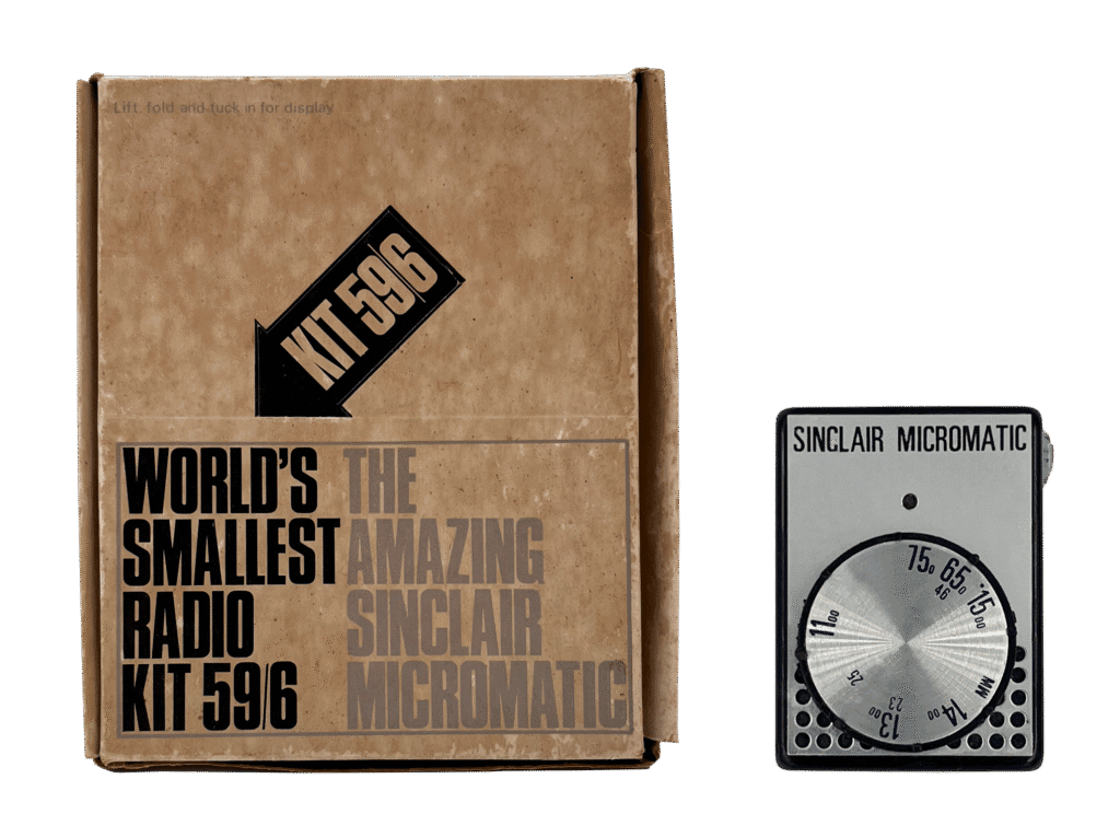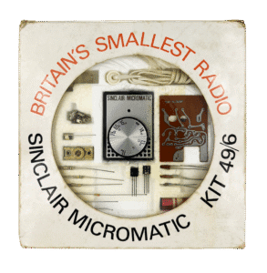Billed as “the world’s smallest radio,” this kit version of the Micromatic invited users to assemble a fully functional AM receiver at home. Like its sibling kits, it featured a compact plastic case, a built-in aerial, and a magnetic earpiece. The internal circuit used just two transistors and two diodes, offering portable reception without the need for an external aerial. In typical Sinclair fashion, the kit’s price was prominently marked on the packaging—and set lower than that of the ready-assembled version to attract attention.