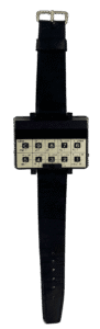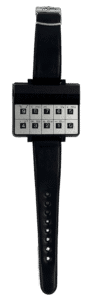 The second version of Sinclair’s wrist-worn calculator featured a gold-coloured face and omitted the separate zero key. Operated with ten buttons and a three-position switch, it performed over 20 functions including memory recall, square roots, and percentages. Sold only in kit form, it came with batteries, display, and all components ready for soldering. Released as interest in personal tech grew, it prefigured later calculator watches and reflected demand for compact computing tools.